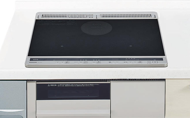 2口IH+ラジエント両面焼きグリル。グリルは両面同時に焼き上げることで焼きムラを防ぎます。グリル皿を使うことで油が落ちやすく、お手入れも簡単です。